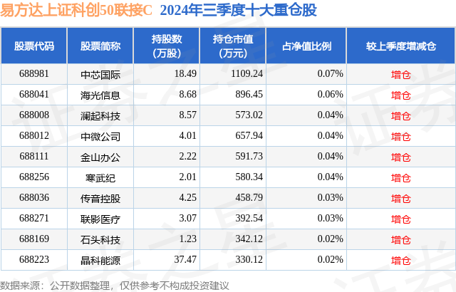从基金规模来看,易方达上证科创50联接C基金2024年三季度公布的基金规模为89.41亿元,较上一期规模68.64亿元变化了20.77亿元,环比变化了30.26%。该基金最新一期资产配置为:股票占净值比0.74%,债券占净值比1.96%,现金占净值比2.4%。从基金持仓来看,该基金当季前十大股票仓位达0.39%,第一大重仓股为中芯国际(688981),持仓占比为0.07%。