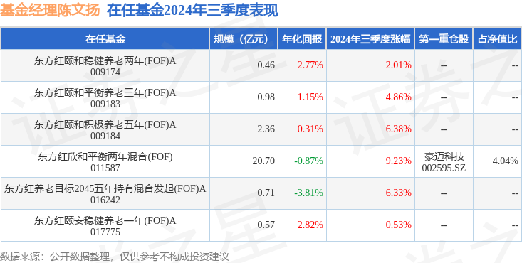 证券之星消息,日前东方红欣和平衡两年混合(FOF)基金公布三季报,2024年三季度最新规模20.7亿元,季度净值涨幅为9.23%。