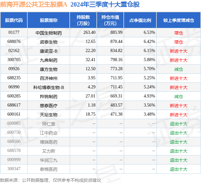 从基金规模来看,前海开源公共卫生股票A基金2024年三季度公布的基金规模为0.81亿元,较上一期规模7695.7万元变化了395.11万元,环比变化了5.13%。该基金最新一期资产配置为:股票占净值比94.08%,无债券类资产,现金占净值比10.21%。从基金持仓来看,该基金当季前十大股票仓位达53.14%,第一大重仓股为中国生物制药(01177),持仓占比为6.53%。
