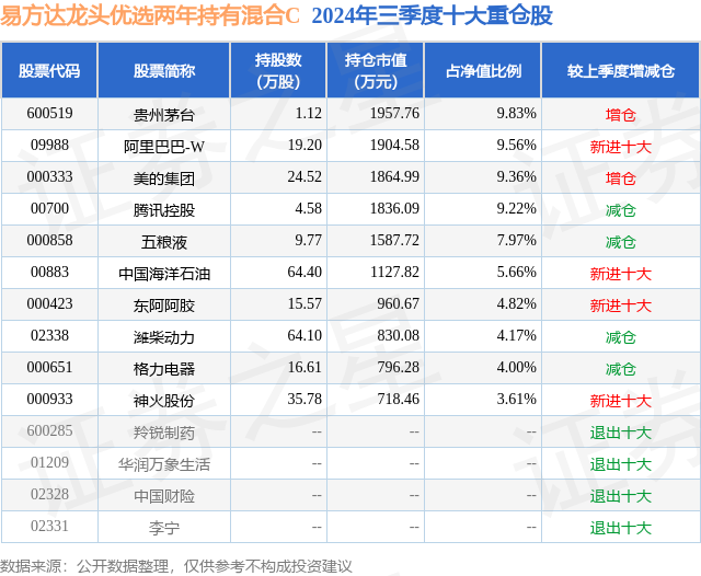 从基金规模来看,易方达龙头优选两年持有混合C基金2024年三季度公布的基金规模为0.34亿元,较上一期规模3198.31万元变化了247.71万元,环比变化了7.75%。该基金最新一期资产配置为:股票占净值比85.97%,无债券类资产,现金占净值比11.07%。从基金持仓来看,该基金当季前十大股票仓位达68.2%,第一大重仓股为贵州茅台(600519),持仓占比为9.83%。