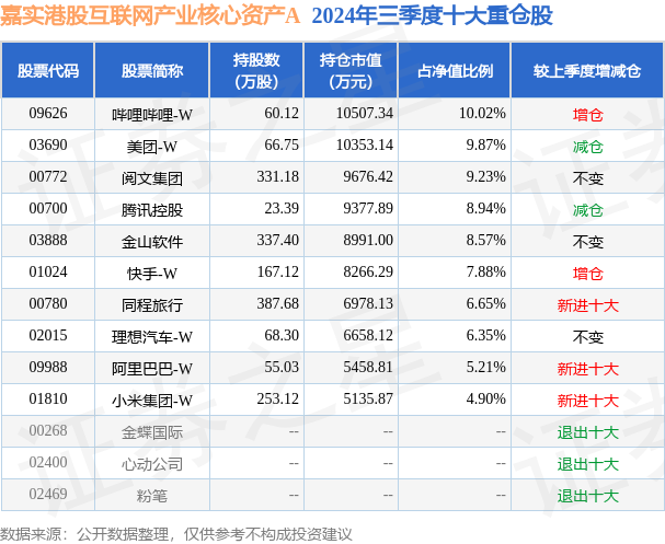 证券之星消息,日前嘉实港股互联网产业核心资产A基金公布三季报,2024年三季度最新规模3.07亿元,季度净值涨幅为23.39%。
