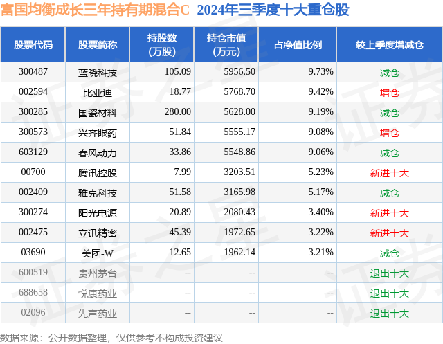 从基金规模来看,富国均衡成长三年持有期混合C基金2024年三季度公布的基金规模为0.41亿元,较上一期规模4298.79万元变化了-209.86万元,环比变化了-4.88%。该基金最新一期资产配置为:股票占净值比91.93%,无债券类资产,现金占净值比7.19%。从基金持仓来看,该基金当季前十大股票仓位达66.71%,第一大重仓股为蓝晓科技(300487),持仓占比为9.73%。