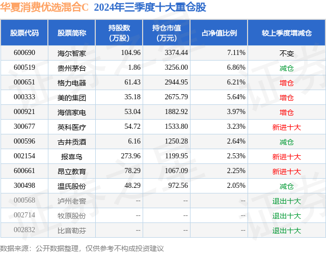 从基金规模来看,华夏消费优选混合C基金2024年三季度公布的基金规模为0.31亿元,较上一期规模2891.93万元变化了213.21万元,环比变化了7.37%。该基金最新一期资产配置为:股票占净值比92.28%,无债券类资产,现金占净值比13.6%。从基金持仓来看,该基金当季前十大股票仓位达42.49%,第一大重仓股为海尔智家(600690),持仓占比为7.11%。