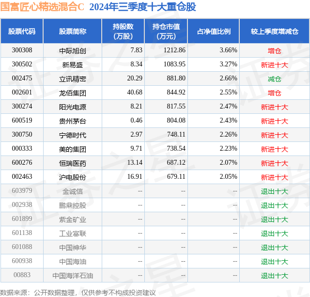 从基金规模来看,国富匠心精选混合C基金2024年三季度公布的基金规模为0.55亿元,较上一期规模8264.75万元变化了-2763.38万元,环比变化了-33.44%。该基金最新一期资产配置为:股票占净值比89.41%,债券占净值比5.47%,现金占净值比6.06%。从基金持仓来看,该基金当季前十大股票仓位达25.65%,第一大重仓股为中际旭创(300308),持仓占比为3.66%。