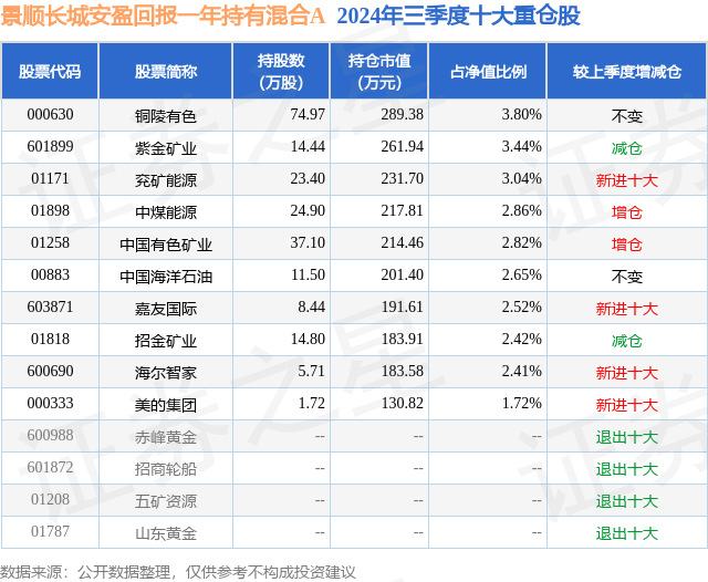 从基金规模来看,景顺长城安盈回报一年持有混合A基金2024年三季度公布的基金规模为0.7亿元,较上一期规模6914.59万元变化了103.14万元,环比变化了1.49%。该基金最新一期资产配置为:股票占净值比33.04%,债券占净值比49.2%,现金占净值比21.83%。从基金持仓来看,该基金当季前十大股票仓位达27.68%,第一大重仓股为铜陵有色(000630),持仓占比为3.8%。