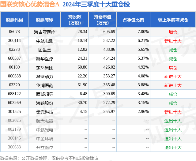从基金规模来看,国联安核心优势混合A基金2024年三季度公布的基金规模为0.87亿元,较上一期规模8418.02万元变化了234.73万元,环比变化了2.79%。该基金最新一期资产配置为:股票占净值比87.27%,债券占净值比5.24%,现金占净值比9.53%。从基金持仓来看,该基金当季前十大股票仓位达46.7%,第一大重仓股为海吉亚医疗(06078),持仓占比为7.0%。