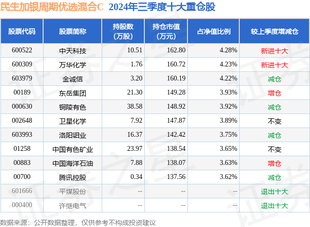 从基金规模来看,民生加银周期优选混合C基金2024年三季度公布的基金规模为0.07亿元,较上一期规模676.96万元变化了34.38万元,环比变化了5.08%。该基金最新一期资产配置为:股票占净值比85.3%,无债券类资产,现金占净值比9.66%。从基金持仓来看,该基金当季前十大股票仓位达39.12%,第一大重仓股为中天科技(600522),持仓占比为4.28%。