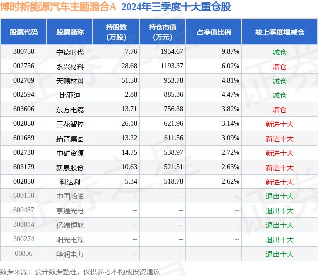 从基金规模来看,博时新能源汽车主题混合A基金2024年三季度公布的基金规模为0.87亿元,较上一期规模8033.16万元变化了682.93万元,环比变化了8.5%。该基金最新一期资产配置为:股票占净值比93.15%,无债券类资产,现金占净值比15.55%。从基金持仓来看,该基金当季前十大股票仓位达43.19%,第一大重仓股为宁德时代(300750),持仓占比为9.87%。