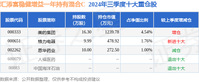 从基金规模来看,汇添富稳健增益一年持有混合C基金2024年三季度公布的基金规模为0.0亿元,较上一期规模9.23万元变化了-0.44万元,环比变化了-4.72%。该基金最新一期资产配置为:股票占净值比7.3%,债券占净值比107.09%,现金占净值比5.1%。从基金持仓来看,该基金当季前十大股票仓位达7.3%,第一大重仓股为美的集团(000333),持仓占比为4.54%。
