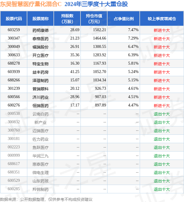 证券之星消息,日前东吴智慧医疗量化混合C基金公布三季报,2024年三季度最新规模0.92亿元,季度净值涨幅为13.49%。