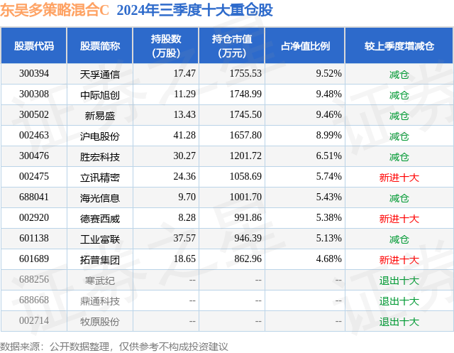 从基金规模来看,东吴多策略混合C基金2024年三季度公布的基金规模为0.73亿元,较上一期规模1.21亿元变化了-4826.86万元,环比变化了-39.73%。该基金最新一期资产配置为:股票占净值比93.07%,无债券类资产,现金占净值比7.07%。从基金持仓来看,该基金当季前十大股票仓位达70.32%,第一大重仓股为天孚通信(300394),持仓占比为9.52%。