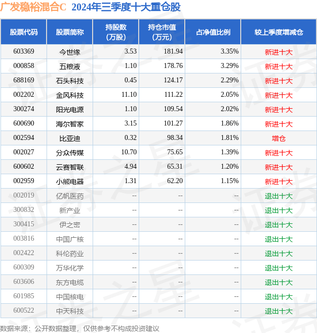 从基金规模来看,广发稳裕混合C基金2024年三季度公布的基金规模为0.0亿元,较上一期规模3.29万元变化了0.51万元,环比变化了15.58%。该基金最新一期资产配置为:股票占净值比33.07%,债券占净值比52.05%,现金占净值比25.65%。从基金持仓来看,该基金当季前十大股票仓位达20.41%,第一大重仓股为今世缘(603369),持仓占比为3.35%。