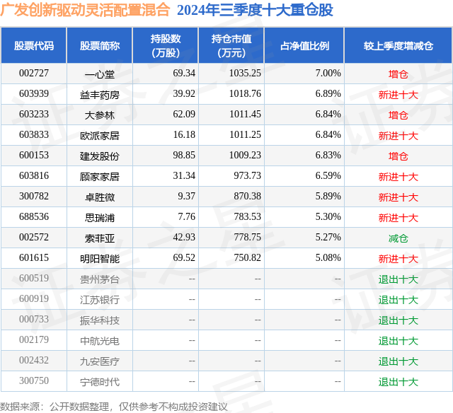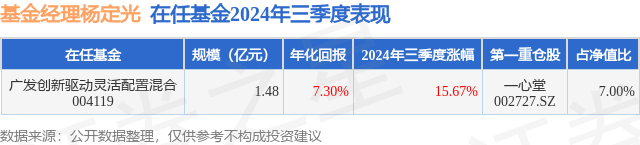 从基金规模来看,广发创新驱动灵活配置混合基金2024年三季度公布的基金规模为1.48亿元,较上一期规模1.28亿元变化了1954.69万元,环比变化了15.24%。该基金最新一期资产配置为:股票占净值比94.57%,无债券类资产,现金占净值比8.7%。从基金持仓来看,该基金当季前十大股票仓位达62.53%,第一大重仓股为一心堂(002727),持仓占比为7.0%。