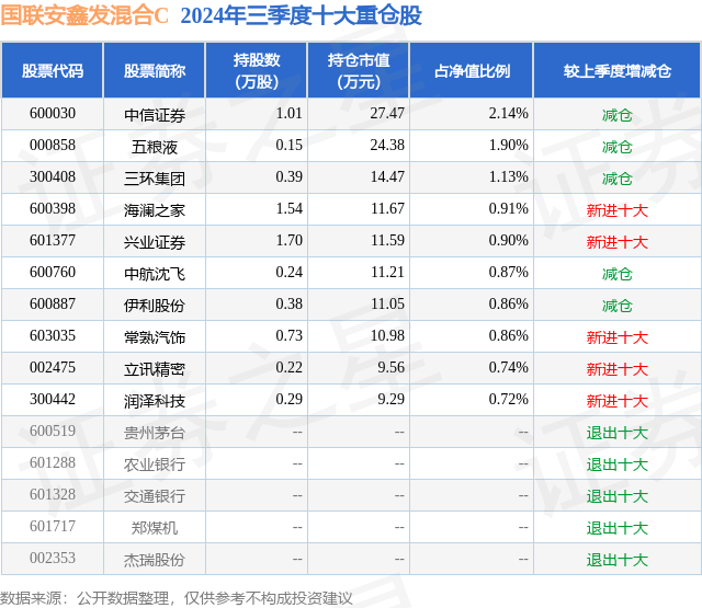 从基金规模来看,国联安鑫发混合C基金2024年三季度公布的基金规模为0.06亿元,较上一期规模675.69万元变化了-82.35万元,环比变化了-12.19%。该基金最新一期资产配置为:股票占净值比26.52%,债券占净值比93.75%,现金占净值比138.62%。从基金持仓来看,该基金当季前十大股票仓位达11.03%,第一大重仓股为中信证券(600030),持仓占比为2.14%。