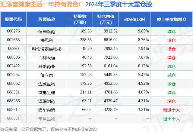 证券之星消息,日前汇添富健康生活一年持有混合C基金公布三季报,2024年三季度最新规模2.02亿元,季度净值涨幅为10.43%。
