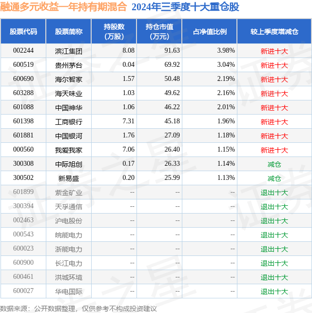 从基金规模来看,融通多元收益一年持有期混合基金2024年三季度公布的基金规模为0.23亿元,较上一期规模2418.11万元变化了-117.34万元,环比变化了-4.85%。该基金最新一期资产配置为:股票占净值比31.43%,债券占净值比64.95%,现金占净值比29.89%。从基金持仓来看,该基金当季前十大股票仓位达19.94%,第一大重仓股为滨江集团(002244),持仓占比为3.98%。