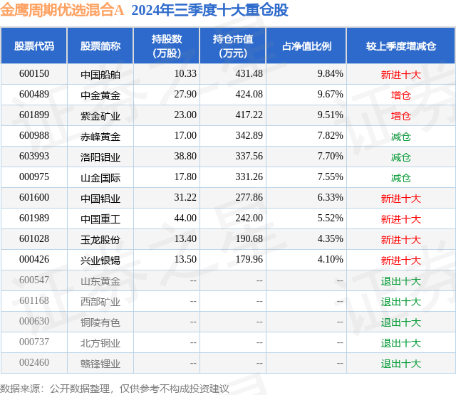 从基金规模来看,金鹰周期优选混合A基金2024年三季度公布的基金规模为0.29亿元,较上一期规模2660.89万元变化了284.07万元,环比变化了10.68%。该基金最新一期资产配置为:股票占净值比94.89%,债券占净值比5.09%,现金占净值比1.72%。从基金持仓来看,该基金当季前十大股票仓位达72.39%,第一大重仓股为中国船舶(600150),持仓占比为9.84%。