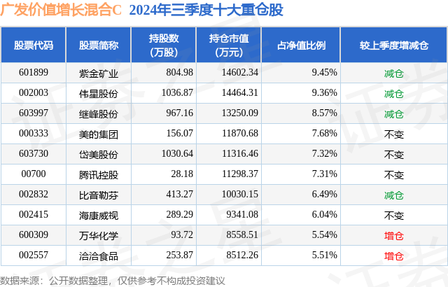 从基金规模来看,广发价值增长混合C基金2024年三季度公布的基金规模为0.67亿元,较上一期规模7398.11万元变化了-716.18万元,环比变化了-9.68%。该基金最新一期资产配置为:股票占净值比94.94%,无债券类资产,现金占净值比5.18%。从基金持仓来看,该基金当季前十大股票仓位达73.27%,第一大重仓股为紫金矿业(601899),持仓占比为9.45%。