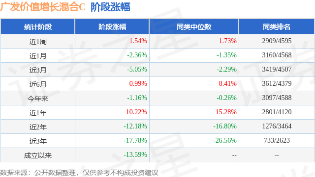 从业绩表现来看,广发价值增长混合C基金过去一年净值涨幅为2.01%,在同类基金中排名2423/3979,同类基金过去一年净值涨幅中位数为5.4%。而基金过去一年的最大回撤为-16.55%,成立以来的最大回撤为-28.29%。