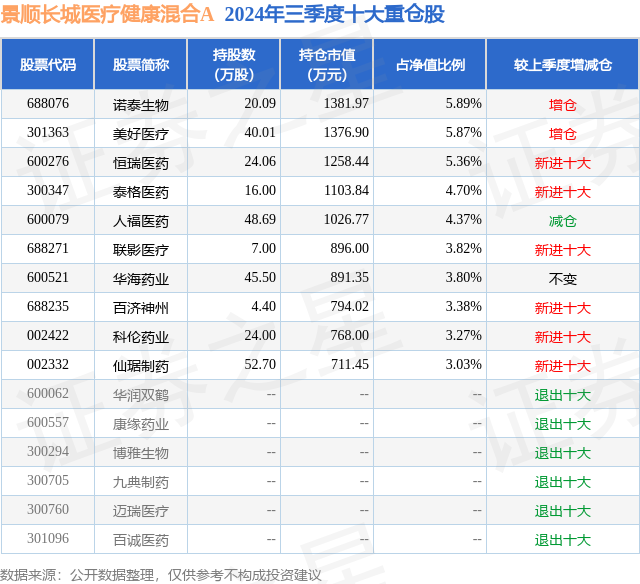 从基金规模来看,景顺长城医疗健康混合A基金2024年三季度公布的基金规模为1.69亿元,较上一期规模1.59亿元变化了1047.81万元,环比变化了6.6%。该基金最新一期资产配置为:股票占净值比92.87%,债券占净值比4.88%,现金占净值比2.62%。从基金持仓来看,该基金当季前十大股票仓位达43.49%,第一大重仓股为诺泰生物(688076),持仓占比为5.89%。