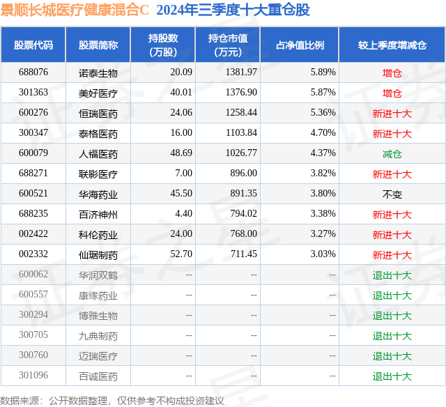 证券之星消息,日前景顺长城医疗健康混合C基金公布三季报,2024年三季度最新规模0.65亿元,季度净值涨幅为10.19%。