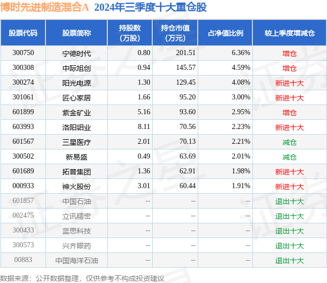 从基金规模来看,博时先进制造混合A基金2024年三季度公布的基金规模为0.19亿元,较上一期规模1795.6万元变化了64.97万元,环比变化了3.62%。该基金最新一期资产配置为:股票占净值比86.11%,无债券类资产,现金占净值比19.56%。从基金持仓来看,该基金当季前十大股票仓位达31.32%,第一大重仓股为宁德时代(300750),持仓占比为6.36%。