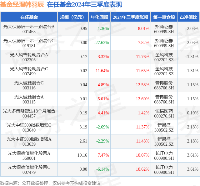 证券之星消息,日前光大多策略智选18个月混合基金公布三季报,2024年三季度最新规模0.19亿元,季度净值涨幅为1.42%。