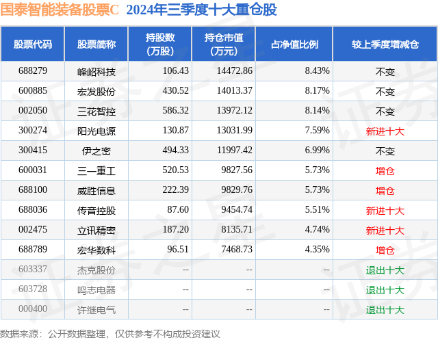 证券之星消息,日前国泰智能装备股票C基金公布三季报,2024年三季度最新规模2.5亿元,季度净值涨幅为11.68%。