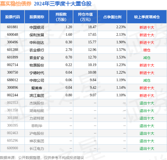 从基金规模来看,嘉实稳怡债券基金2024年三季度公布的基金规模为0.08亿元,较上一期规模945.32万元变化了-117.32万元,环比变化了-12.41%。该基金最新一期资产配置为:股票占净值比29.08%,债券占净值比84.03%,现金占净值比5.5%。从基金持仓来看,该基金当季前十大股票仓位达15.24%,第一大重仓股为中国银河(601881),持仓占比为2.23%。