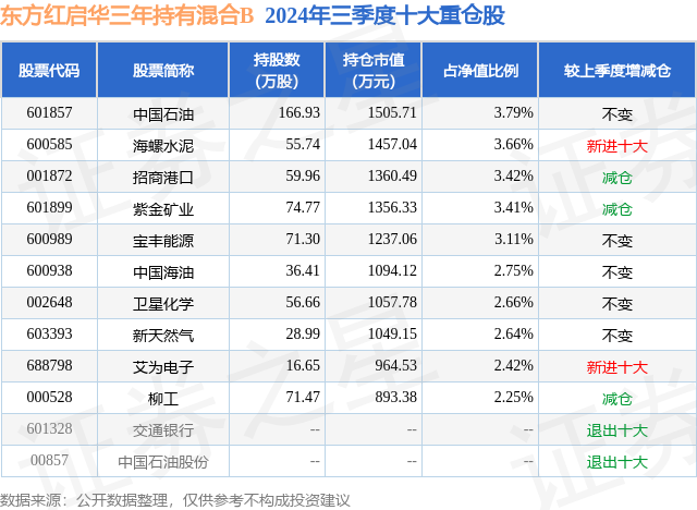 从基金规模来看,东方红启华三年持有混合B基金2024年三季度公布的基金规模为0.75亿元,较上一期规模8347.34万元变化了-823.48万元,环比变化了-9.87%。该基金最新一期资产配置为:股票占净值比85.29%,无债券类资产,现金占净值比14.54%。从基金持仓来看,该基金当季前十大股票仓位达30.11%,第一大重仓股为中国石油(601857),持仓占比为3.79%。