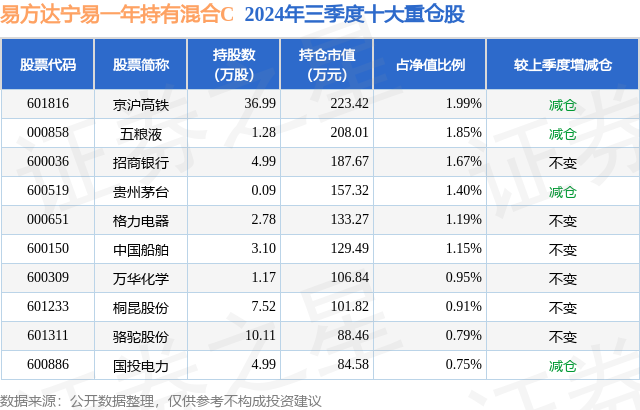 从基金规模来看,易方达宁易一年持有混合C基金2024年三季度公布的基金规模为0.13亿元,较上一期规模1386.29万元变化了-57.01万元,环比变化了-4.11%。该基金最新一期资产配置为:股票占净值比17.33%,债券占净值比100.48%,现金占净值比1.87%。从基金持仓来看,该基金当季前十大股票仓位达12.65%,第一大重仓股为京沪高铁(601816),持仓占比为1.99%。