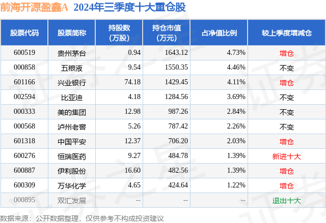 从基金规模来看,前海开源盈鑫A基金2024年三季度公布的基金规模为0.04亿元,较上一期规模331.22万元变化了39.47万元,环比变化了11.92%。该基金最新一期资产配置为:股票占净值比47.45%,债券占净值比38.18%,现金占净值比14.44%。从基金持仓来看,该基金当季前十大股票仓位达28.12%,第一大重仓股为贵州茅台(600519),持仓占比为4.73%。