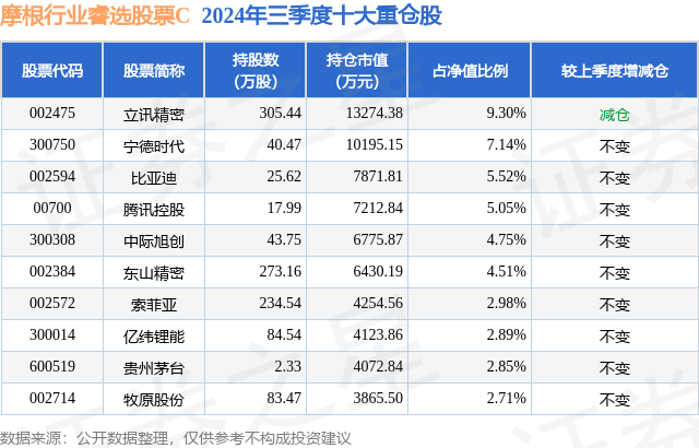 从基金规模来看,摩根行业睿选股票C基金2024年三季度公布的基金规模为2.89亿元,较上一期规模2.58亿元变化了3068.07万元,环比变化了11.88%。该基金最新一期资产配置为:股票占净值比94.16%,无债券类资产,现金占净值比5.04%。从基金持仓来看,该基金当季前十大股票仓位达47.7%,第一大重仓股为立讯精密(002475),持仓占比为9.3%。