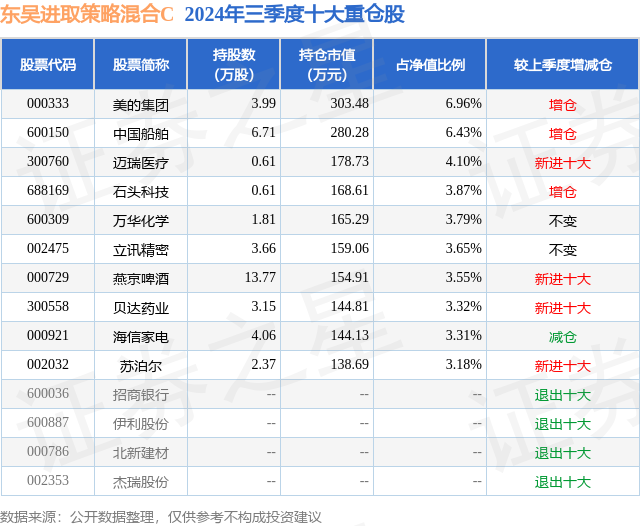 从基金规模来看,东吴进取策略混合C基金2024年三季度公布的基金规模为0.0亿元,较上一期规模37.19万元变化了2.65万元,环比变化了7.12%。该基金最新一期资产配置为:股票占净值比78.2%,无债券类资产,现金占净值比22.54%。从基金持仓来看,该基金当季前十大股票仓位达42.16%,第一大重仓股为美的集团(000333),持仓占比为6.96%。