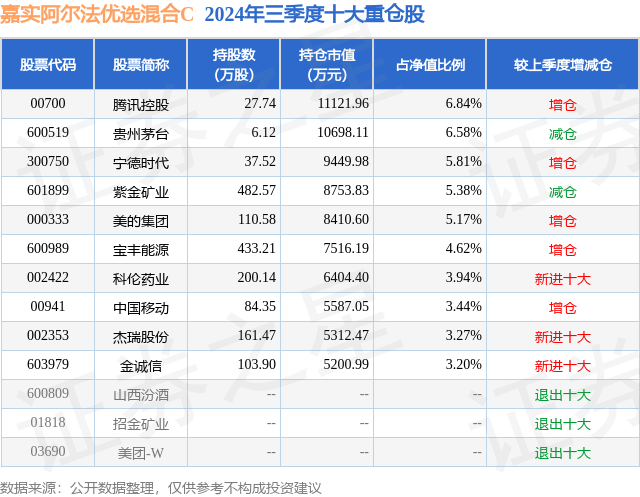 从基金规模来看,嘉实阿尔法优选混合C基金2024年三季度公布的基金规模为1.18亿元,较上一期规模1.1亿元变化了805.82万元,环比变化了7.35%。该基金最新一期资产配置为:股票占净值比91.14%,债券占净值比4.19%,现金占净值比2.12%。从基金持仓来看,该基金当季前十大股票仓位达48.25%,第一大重仓股为腾讯控股(00700),持仓占比为6.84%。