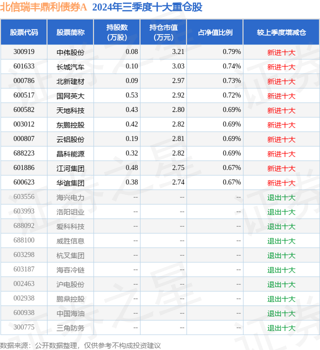 从基金规模来看,北信瑞丰鼎利债券A基金2024年三季度公布的基金规模为0.02亿元,较上一期规模236.78万元变化了-13.86万元,环比变化了-5.86%。该基金最新一期资产配置为:股票占净值比18.98%,债券占净值比80.56%,现金占净值比1.48%。从基金持仓来看,该基金当季前十大股票仓位达7.08%,第一大重仓股为中伟股份(300919),持仓占比为0.79%。
