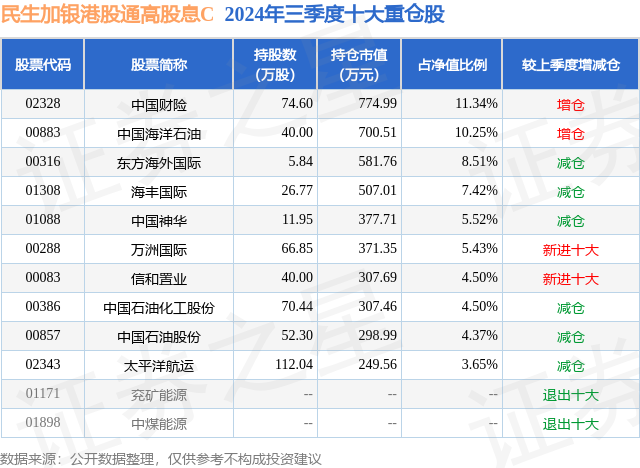 从基金规模来看,民生加银港股通高股息C基金2024年三季度公布的基金规模为0.29亿元,较上一期规模4061.95万元变化了-1206.53万元,环比变化了-29.7%。该基金最新一期资产配置为:股票占净值比94.59%,债券占净值比1.18%,现金占净值比6.87%。从基金持仓来看,该基金当季前十大股票仓位达65.49%,第一大重仓股为中国财险(02328),持仓占比为11.34%。