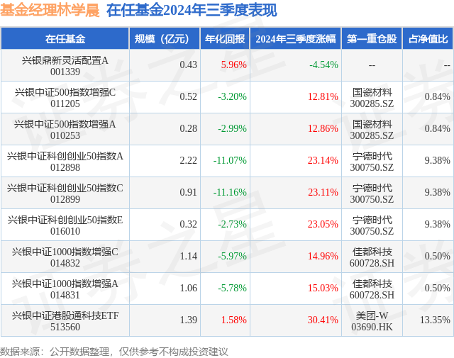 兴银中证500指数增强C现任基金经理为林学晨 翁子晨,本季度增聘基金经理翁子晨。其中在任基金经理林学晨已从业3年又104天,2021年7月16日正式接手管理兴银中证500指数增强C,任职期间累计回报为-20.42%。目前还管理着9只基金产品(包括A类和C类),其中本季度表现最佳的基金为兴银中证港股通科技ETF(513560),季度净值涨幅为30.41%。