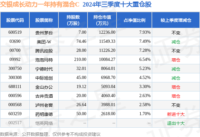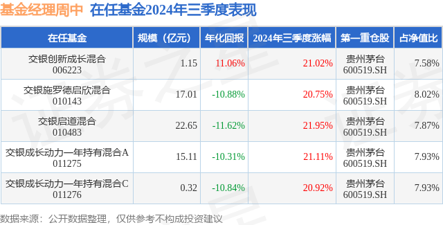 从基金规模来看,交银成长动力一年持有混合C基金2024年三季度公布的基金规模为0.32亿元,较上一期规模2742.95万元变化了414.04万元,环比变化了15.09%。该基金最新一期资产配置为:股票占净值比92.41%,无债券类资产,现金占净值比8.35%。从基金持仓来看,该基金当季前十大股票仓位达49.2%,第一大重仓股为贵州茅台(600519),持仓占比为7.93%。
