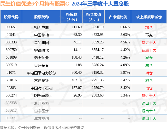 从基金规模来看,民生价值优选6个月持有股票C基金2024年三季度公布的基金规模为0.25亿元,较上一期规模2441.19万元变化了79.88万元,环比变化了3.27%。该基金最新一期资产配置为:股票占净值比87.16%,无债券类资产,现金占净值比11.1%。从基金持仓来看,该基金当季前十大股票仓位达43.82%,第一大重仓股为格力电器(000651),持仓占比为6.66%。