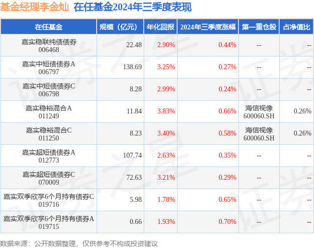 从基金规模来看,嘉实稳裕混合A基金2024年三季度公布的基金规模为11.84亿元,较上一期规模13.14亿元变化了-1.3亿元,环比变化了-9.88%。该基金最新一期资产配置为:股票占净值比2.27%,债券占净值比124.93%,现金占净值比1.54%。从基金持仓来看,该基金当季前十大股票仓位达1.54%,第一大重仓股为海信视像(600060),持仓占比为0.26%。