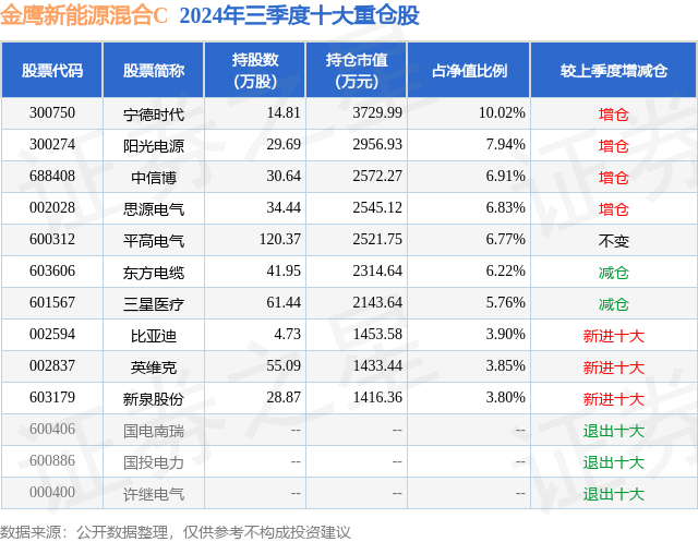 从基金规模来看,金鹰新能源混合C基金2024年三季度公布的基金规模为1.73亿元,较上一期规模1.7亿元变化了373.81万元,环比变化了2.2%。该基金最新一期资产配置为:股票占净值比93.35%,无债券类资产,现金占净值比3.62%。从基金持仓来看,该基金当季前十大股票仓位达62.0%,第一大重仓股为宁德时代(300750),持仓占比为10.02%。