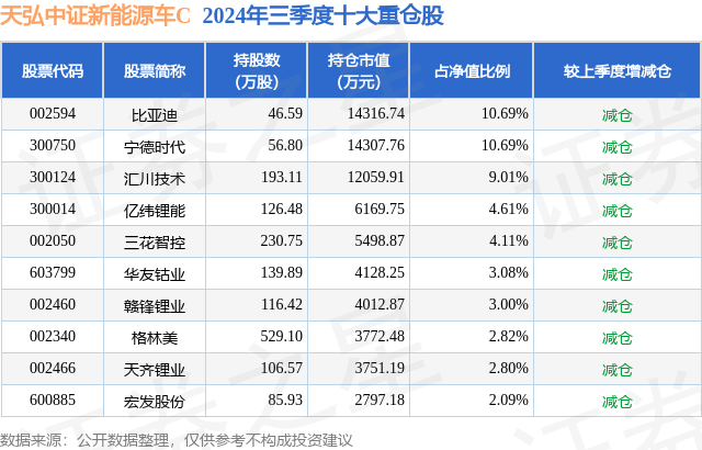 从基金规模来看,天弘中证新能源车C基金2024年三季度公布的基金规模为11.94亿元,较上一期规模10.3亿元变化了1.64亿元,环比变化了15.95%。该基金最新一期资产配置为:股票占净值比93.63%,债券占净值比0.16%,现金占净值比4.9%。从基金持仓来看,该基金当季前十大股票仓位达52.9%,第一大重仓股为比亚迪(002594),持仓占比为10.69%。