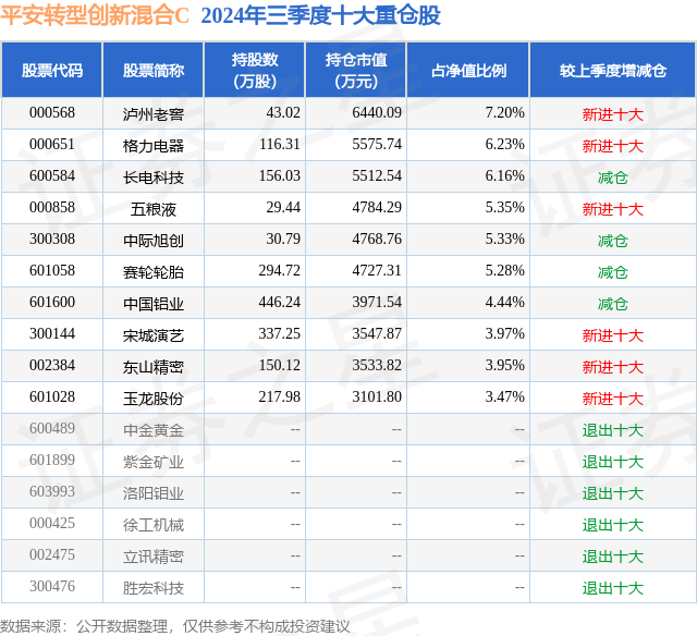 从基金规模来看,平安转型创新混合C基金2024年三季度公布的基金规模为2.63亿元,较上一期规模2.61亿元变化了198.03万元,环比变化了0.76%。该基金最新一期资产配置为:股票占净值比92.36%,债券占净值比2.39%,现金占净值比5.33%。从基金持仓来看,该基金当季前十大股票仓位达51.38%,第一大重仓股为泸州老窖(000568),持仓占比为7.2%。
