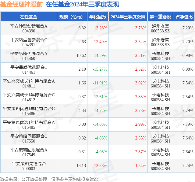 平安转型创新混合A现任基金经理为神爱前。其中在任基金经理神爱前已从业8年又102天,2019年12月25日正式接手管理平安转型创新混合A,任职期间累计回报为88.1%。目前还管理着11只基金产品(包括A类和C类),其中本季度表现最佳的基金为平安转型创新混合A(004390),季度净值涨幅为3.73%。