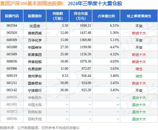 从基金规模来看,富国沪深300基本面精选股票C基金2024年三季度公布的基金规模为0.57亿元,较上一期规模4238.97万元变化了1471.06万元,环比变化了34.7%。该基金最新一期资产配置为:股票占净值比94.18%,无债券类资产,现金占净值比5.56%。从基金持仓来看,该基金当季前十大股票仓位达43.59%,第一大重仓股为比亚迪(002594),持仓占比为6.31%。