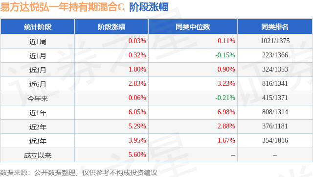 从业绩表现来看,易方达悦弘一年持有期混合C基金过去一年净值涨幅为3.99%,在同类基金中排名754/1322,同类基金过去一年净值涨幅中位数为4.43%。而基金过去一年的最大回撤为-2.7%,成立以来的最大回撤为-4.15%。