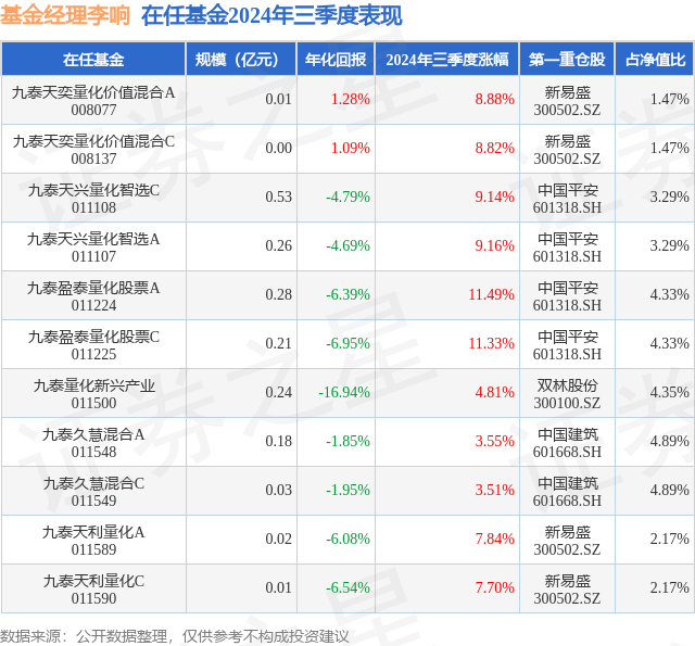 证券之星消息,日前九泰量化新兴产业基金公布三季报,2024年三季度最新规模0.24亿元,季度净值涨幅为4.81%。