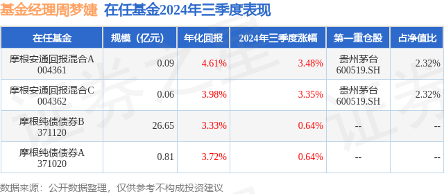 证券之星消息,日前摩根安通回报混合C基金公布三季报,2024年三季度最新规模0.06亿元,季度净值涨幅为3.35%。