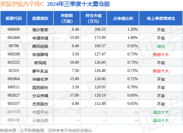 从基金规模来看,天弘宁弘六个月C基金2024年三季度公布的基金规模为0.52亿元,较上一期规模5728.01万元变化了-480.96万元,环比变化了-8.4%。该基金最新一期资产配置为:股票占净值比11.66%,债券占净值比100.52%,现金占净值比8.51%。从基金持仓来看,该基金当季前十大股票仓位达8.07%,第一大重仓股为海尔智家(600690),持仓占比为1.2%。